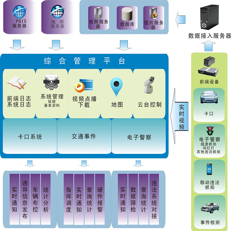 智能交通綜合管理系統集成平臺是一個融合城市交通管理業務、公安交警信息管理業務、交通信息服務、高速網絡傳輸、海量數據存儲、多系統集成的復雜系統。整個平臺是根據城市交通管理各業務部門、各警種的職能要求并結合信息共享、業務協同、高效率管理、優質服務的原則進行設計,平臺預留了大量與公安、交警已有應用系統的數據接口。該系統平臺是建立在公安視頻信息專網系統協議層之上,可以作為各級公安交通指揮系統的統一信息服務平臺,在公安派出所、區公安局、市公安局和省公安廳之間實現了信息授權交換與共享。平臺通過對采集到的交通靜態與動態數據分析加工處理,來實施交通狀態監控、交通態勢分析、交通秩序管理控制、交通誘導、治安監控,及時對交通事件、違章行為進行處理,并通過多種渠道將治安、交通信息發布給各級公安、交警部門,實現了城市交通數字化管理。